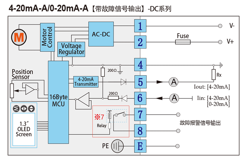 7、可選功能:故障信號輸出:繼電器觸點輸出。觸點帶載能力0.1A/AC220V、0.5A/DC24V。