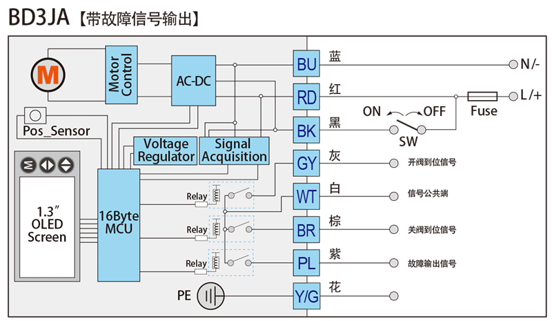 SW斷開,電動執(zhí)行器將順時針旋轉(zhuǎn),到位后WT與BR接通,給出關(guān)閥到位信號。
