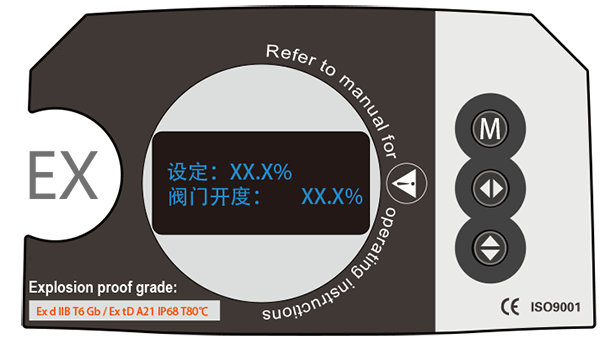 采用0.96寸OLED液晶,無視角限制,高亮度,節能環保,實時顯示閥門開度及其外部控制命令,約5分鐘后自動進入休眠狀態,并在休眠期間提示位置狀態及其控制命令。