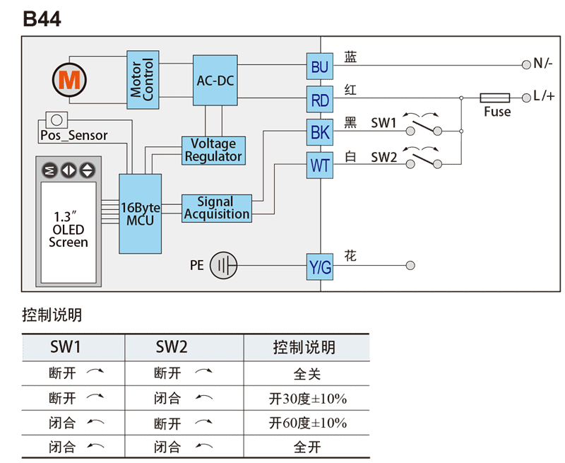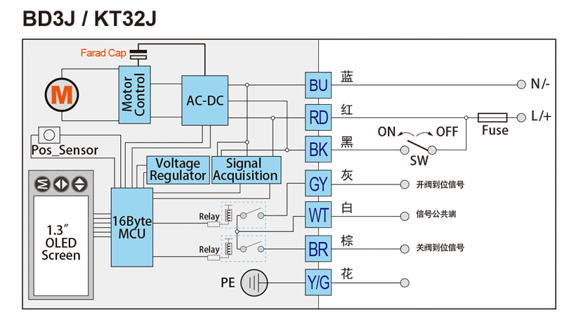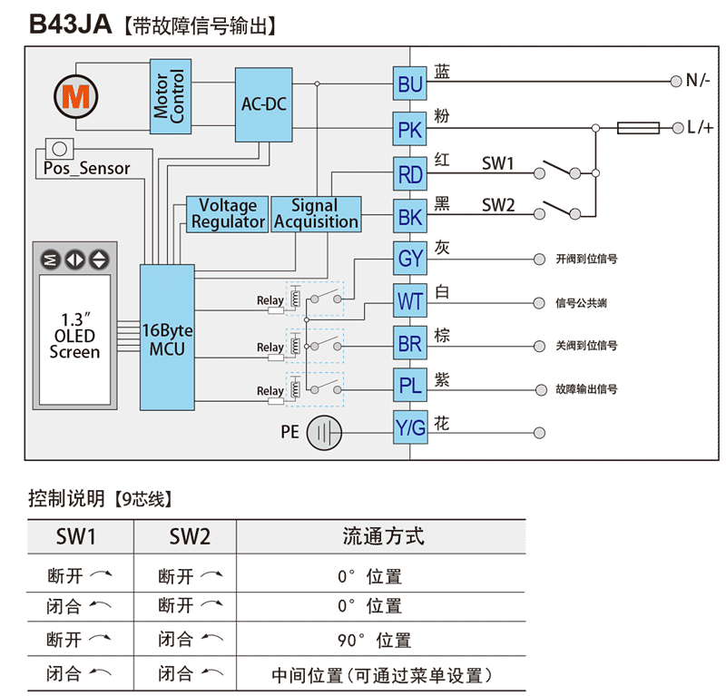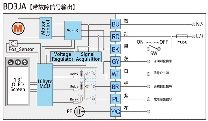 SW切換至BK,電動(dòng)執(zhí)行器將逆時(shí)針旋轉(zhuǎn),到位后 WT與GY接通,給出開(kāi)閥到位信號(hào)。
